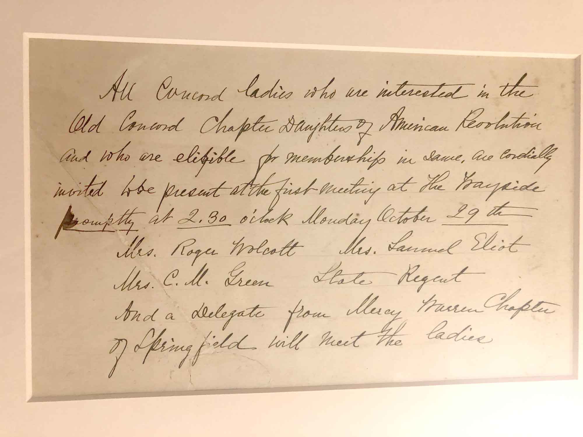 The first gathering of the Old Concord Chapter was held at Harriet’s home, The Wayside, formerly the home of Samuel Whitney, Master of the Concord Minute Men; the Alcott family; and Nathaniel Hawthorne. The Old Concord Chapter was the sixth to be formed in Massachusetts.