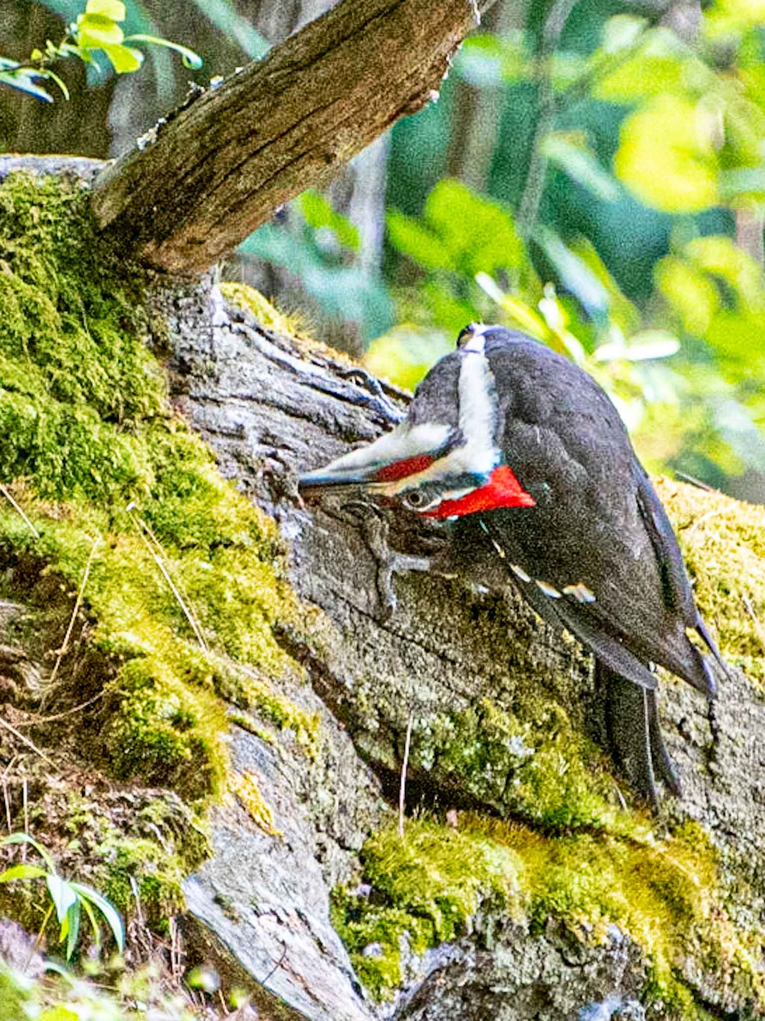A Pileated Woodpecker bends its neck to gather insects—a much easier job in the spring than it was in the winter.