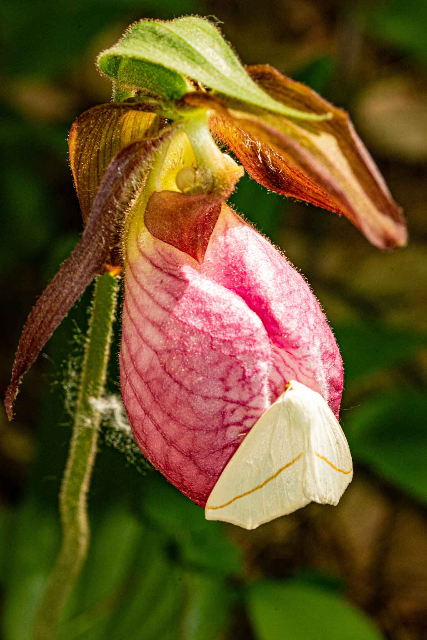 Lady’s slipper orchids are some of spring’s loveliest flowers. A White Slant-line Moth visits this Lady’s Slipper.