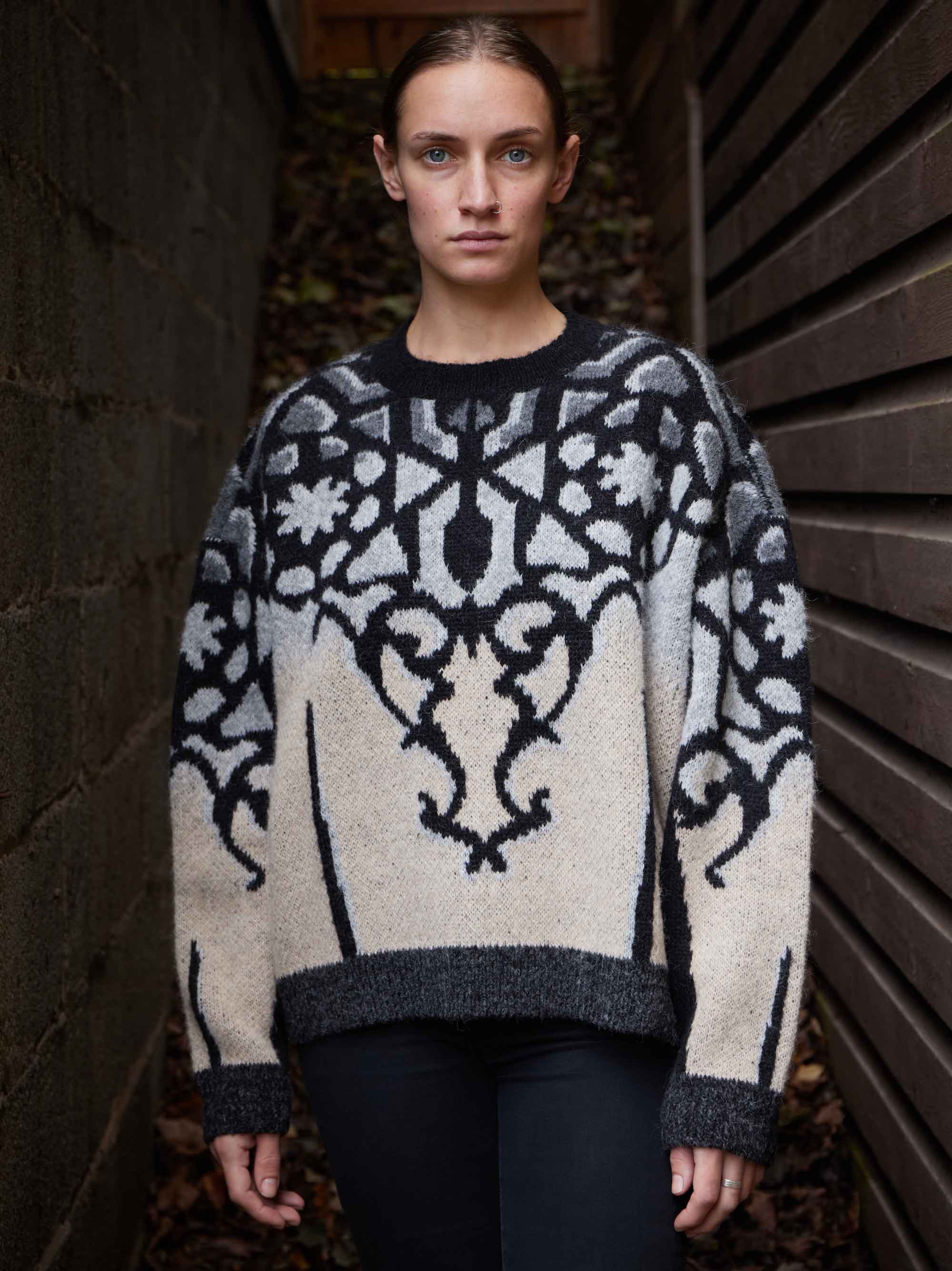 “I’m drawn to humble objects, like those we hide in the attic or put on display.” From this came “Bracket,” a sweater design inspired by a simple, Victorian-era bookshelf holder.