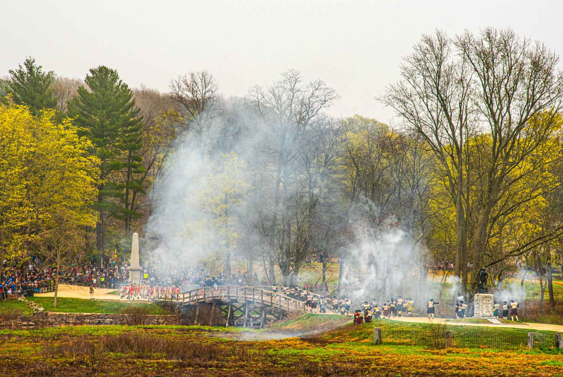 | Dave WitherbeeReenactors add their own colorful display on Patriots’ Day.