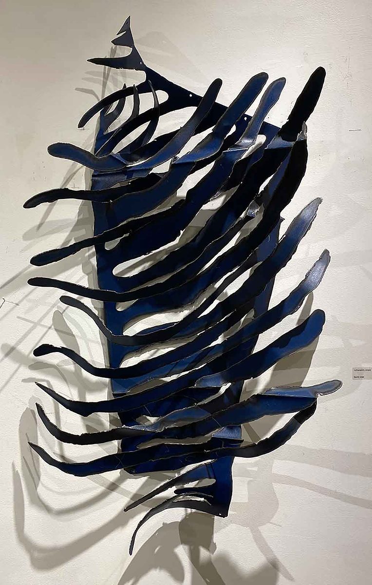 Metal artist Ray Ciemny spends his days creating beautiful iron and steel railings, banisters, fountains, and other objects for homes in the New England area. In his free time, Ray loves turning discarded and unused metal into stunning works of art for homes and gardens. Working in wrought iron, copper, bronze, brass, and other architectural metals, Ray assembles his unique, often edgy (no pun intended) pieces of art. He has turned a snow sled into a flying angel, thin winding metal thread into a large horse reminiscent of a cave drawing, and different colors of roof metal into abstract sculpture. His whimsey and technique invite us into a world of exciting fresh perspective.