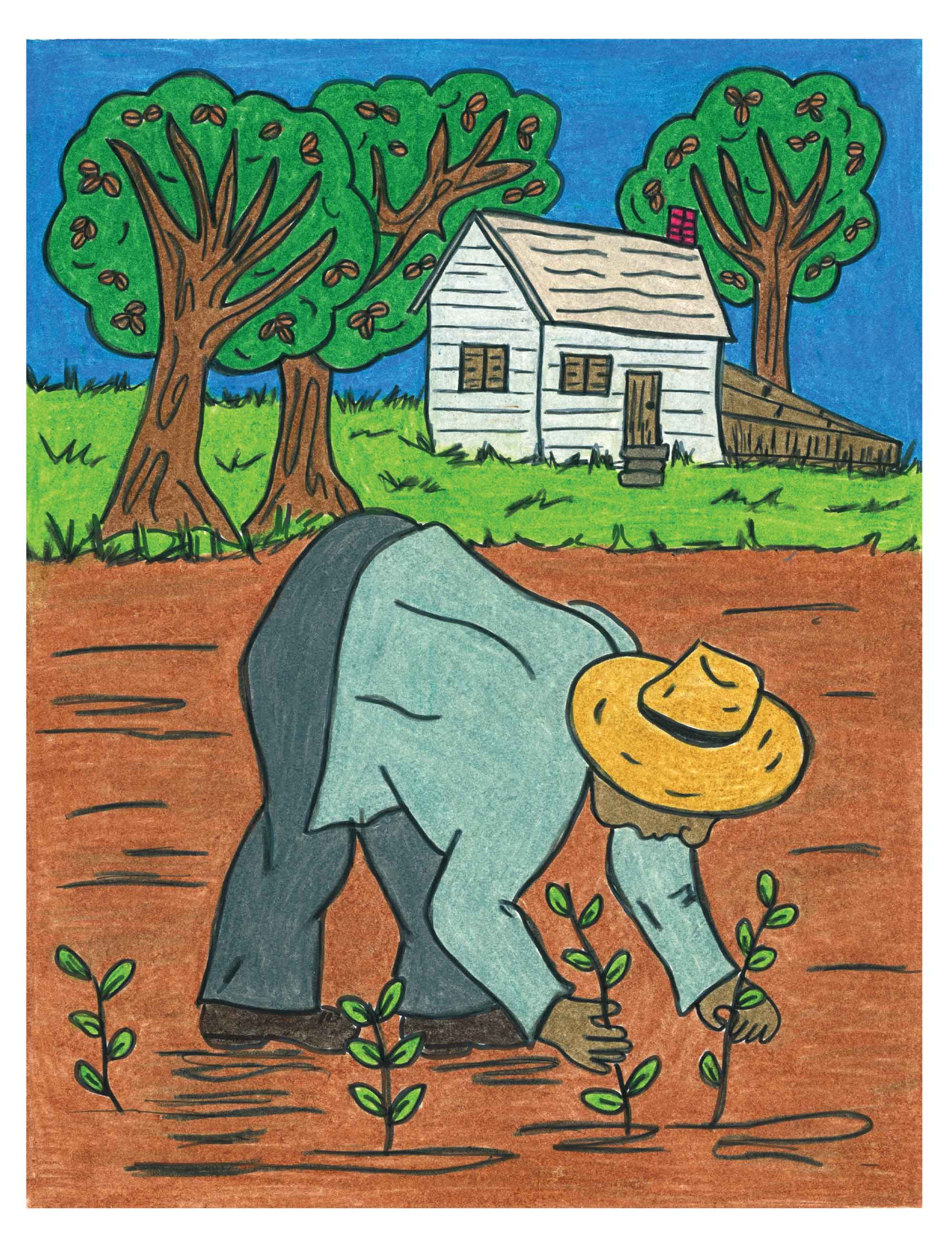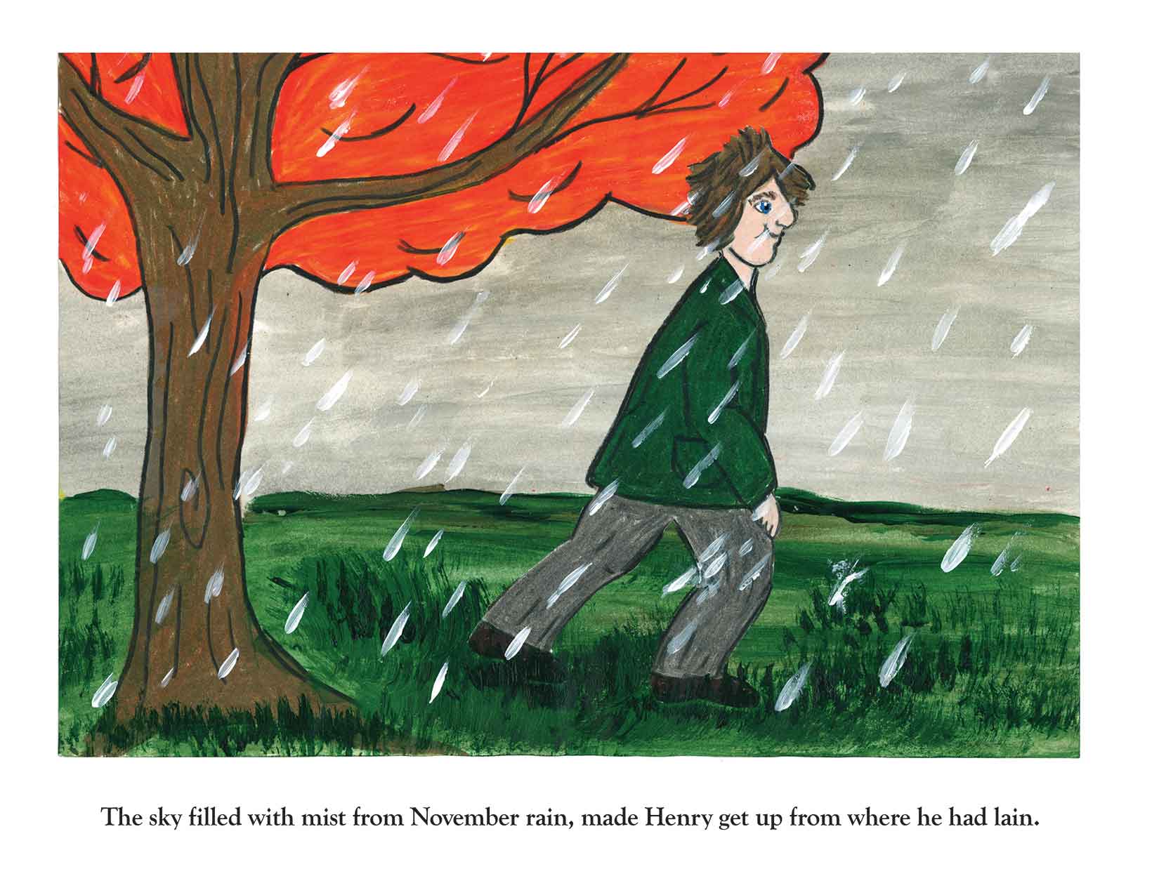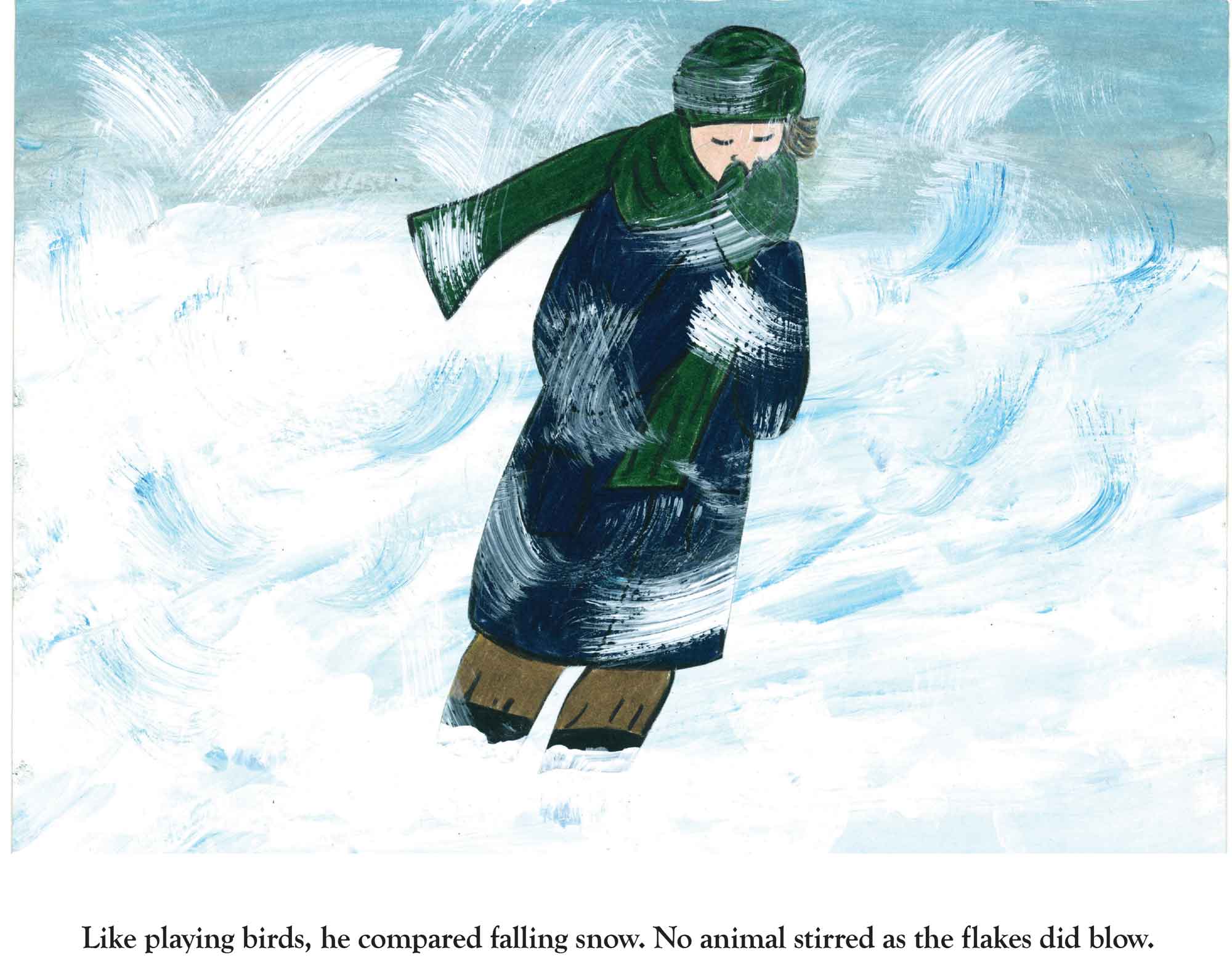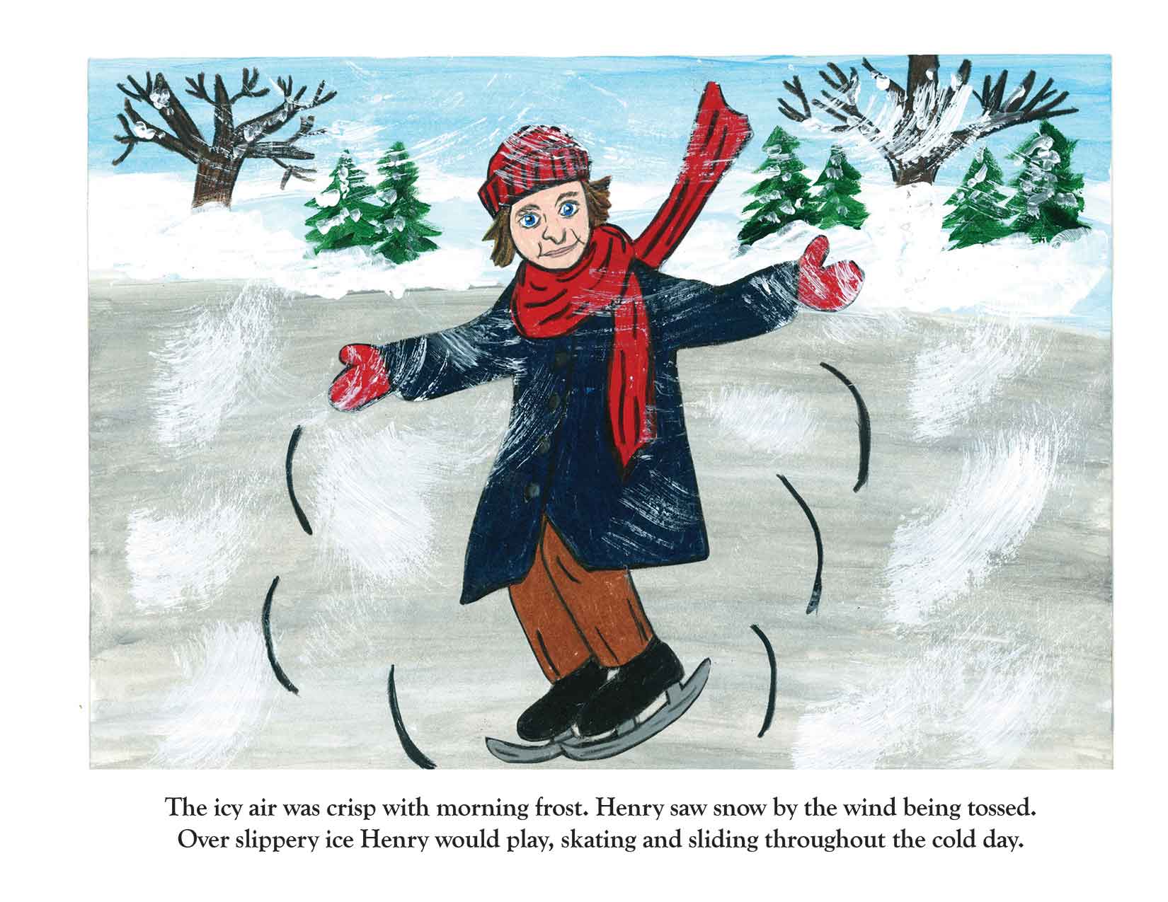 Donna Marie’s development as an artist is evident in these illustrations, with their notable detail and refinement, and brilliant color. An image of Henry walking in a November rain recalls Daniel Ricketson’s 1855 sketch of him “returning to his shanty from Concord.” Another illustration, of Henry leaning into the wind as snowflakes eddy around him, is an impressionistic gem.
