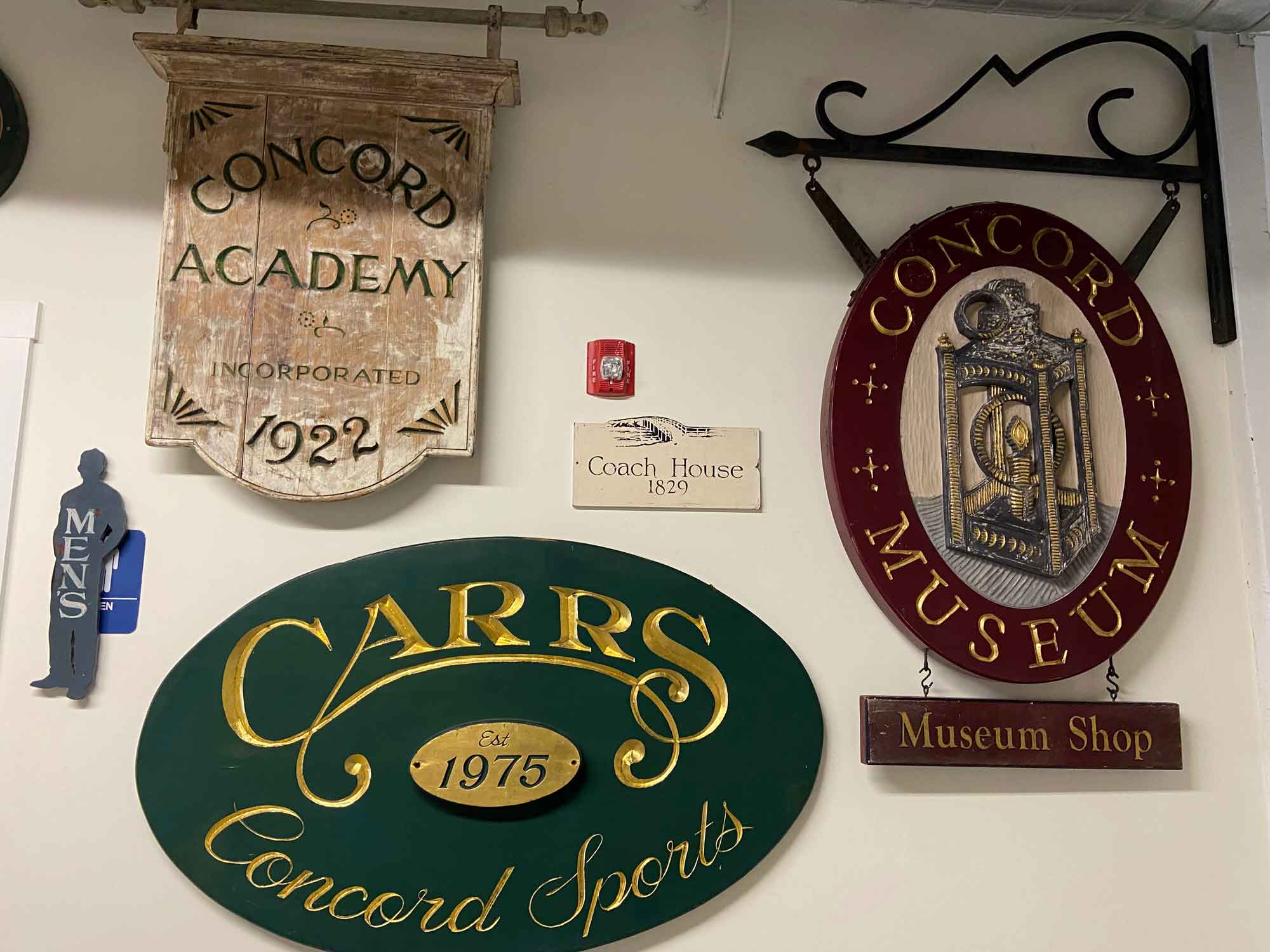 In the decades before computers made everyone familiar with the notion of a font, consistent lettering was created by an artist’s hand. Before Billy, Charlie Mogan was the Concord sign painter in the 1950s and 1960s. Some of his work is signed, other pieces can be identified by his distinctive use of “gold leaf and a classic look.” In the Museum, the current arrangement is informal, everywhere they will fit, taken completely out of their native context. They certainly hold their own as objects of art.