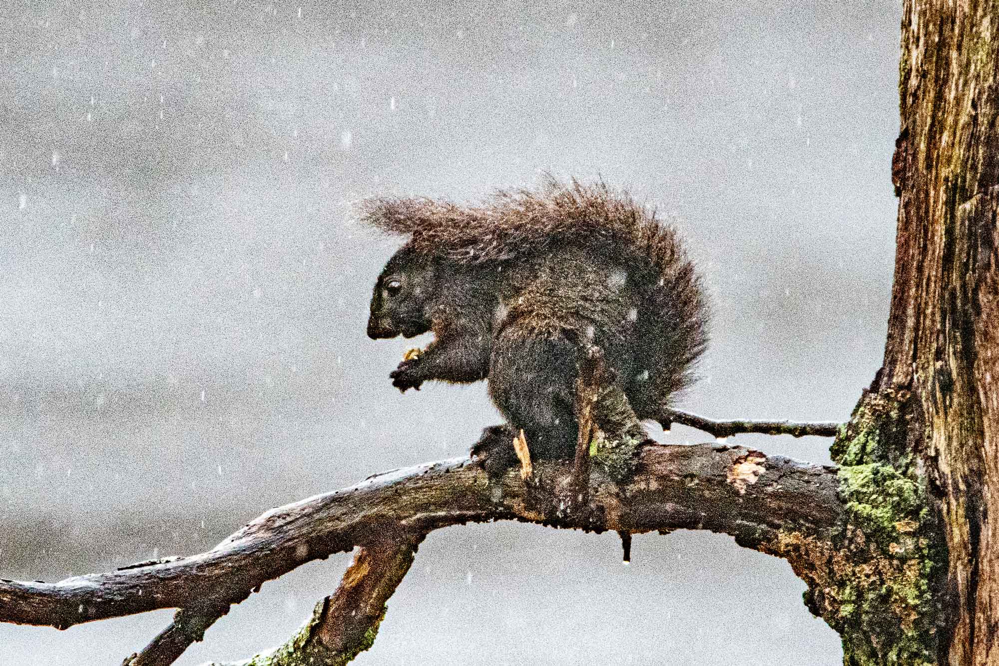 Black squirrels are morphs of gray squirrels and are fun to see, especially in the snowy winter. They know how to use a good blanket to stay warm.