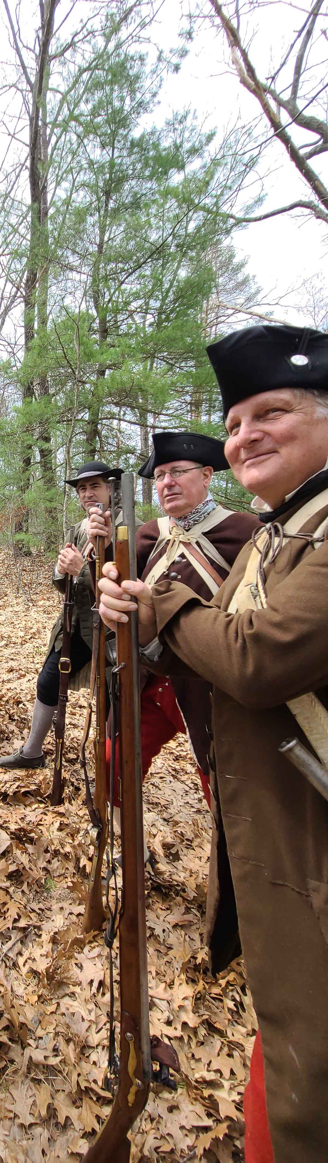 Mike Sutila, Bob Stiles and Mike Audette of the Acton Minute Men wait in the woods for the arrival of the British column at Battle Road 2023.