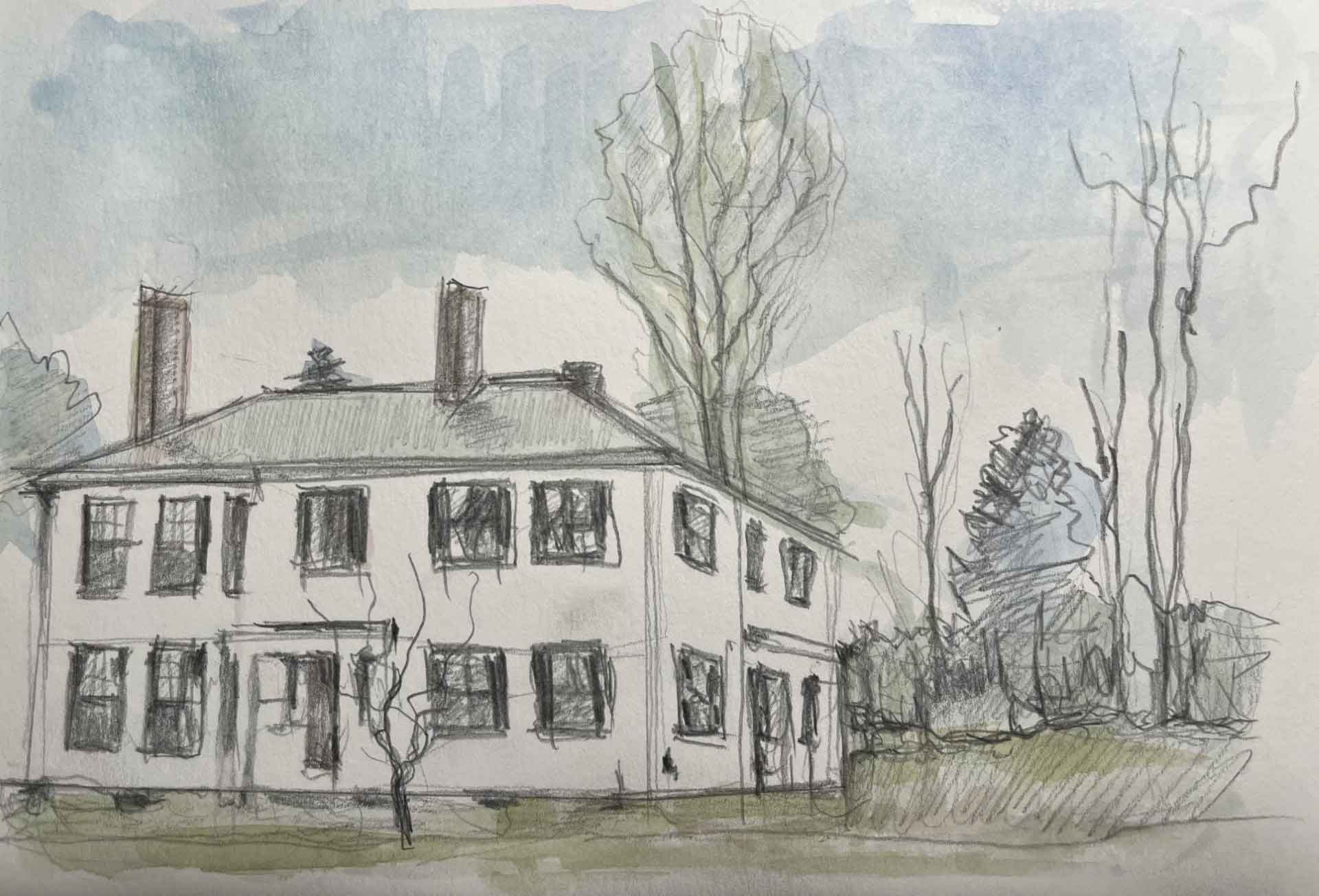 Simplicity weaves a rich tapestry of beauty and a sense of quietness in the landscapes surrounding Concord. Among them is Emerson’s humble potato garden, where a solitary tree is bordered by a weathered fence. This sketch evokes a meditative calm, capturing moments of stillness that remind us of the profound experiences that often stem from the simplest things, drawing attention to the elegance found in the everyday. And as Ralph Waldo Emerson poignantly expressed, “The invariable mark of wisdom is to see the miraculous in the common.” It might be in the gentle rustle of leaves, the serene play of light across a quiet room, or the unassuming bloom of a wildflower that we find a deeper connection to the world around us.